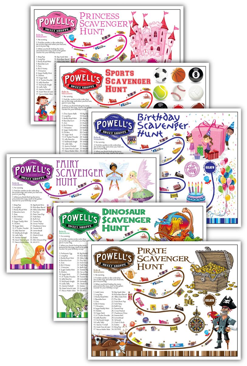 The original scavenger hunt map is still available and has a selection of over 30 candies, many retro favorites. Talk about being a kid in a candy store. Big kids, little kids, adult kids, Billy the Kid -everyone will love a birthday party at Powell's!